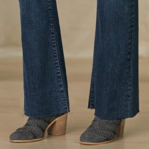 Flattering and timeless. these five-pocket jeans are defined by a flare silhouette and an unfinished hem. Cotton/polyester/lycra. Machine wash. Imported. Sizes 24-32. Approx. 31.5 inseam; 10.25 rise; 20 leg opening. These jeans run one size small. it is recommended to size up.